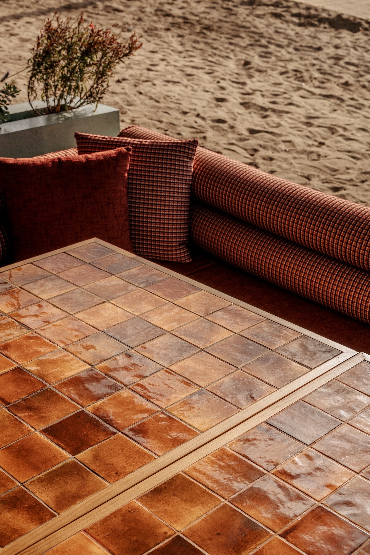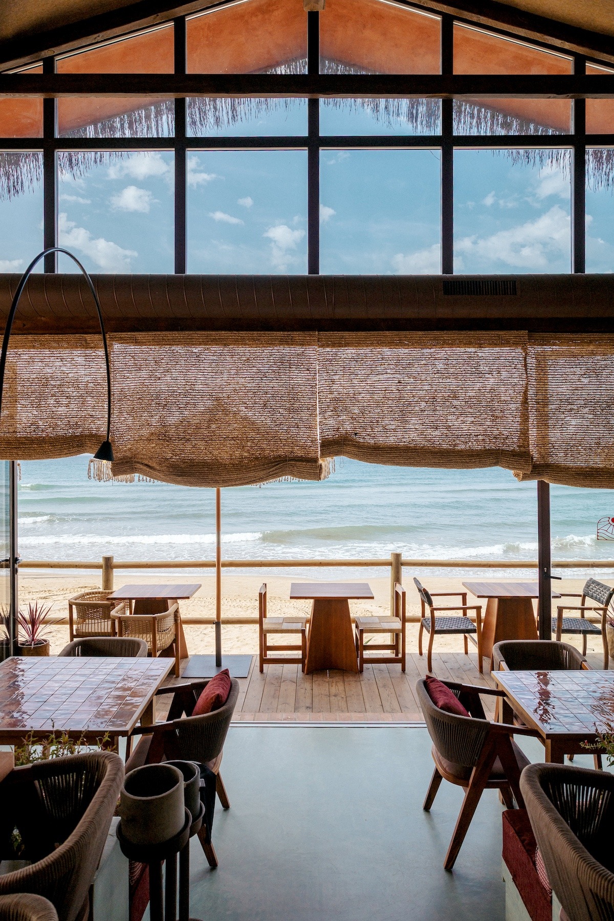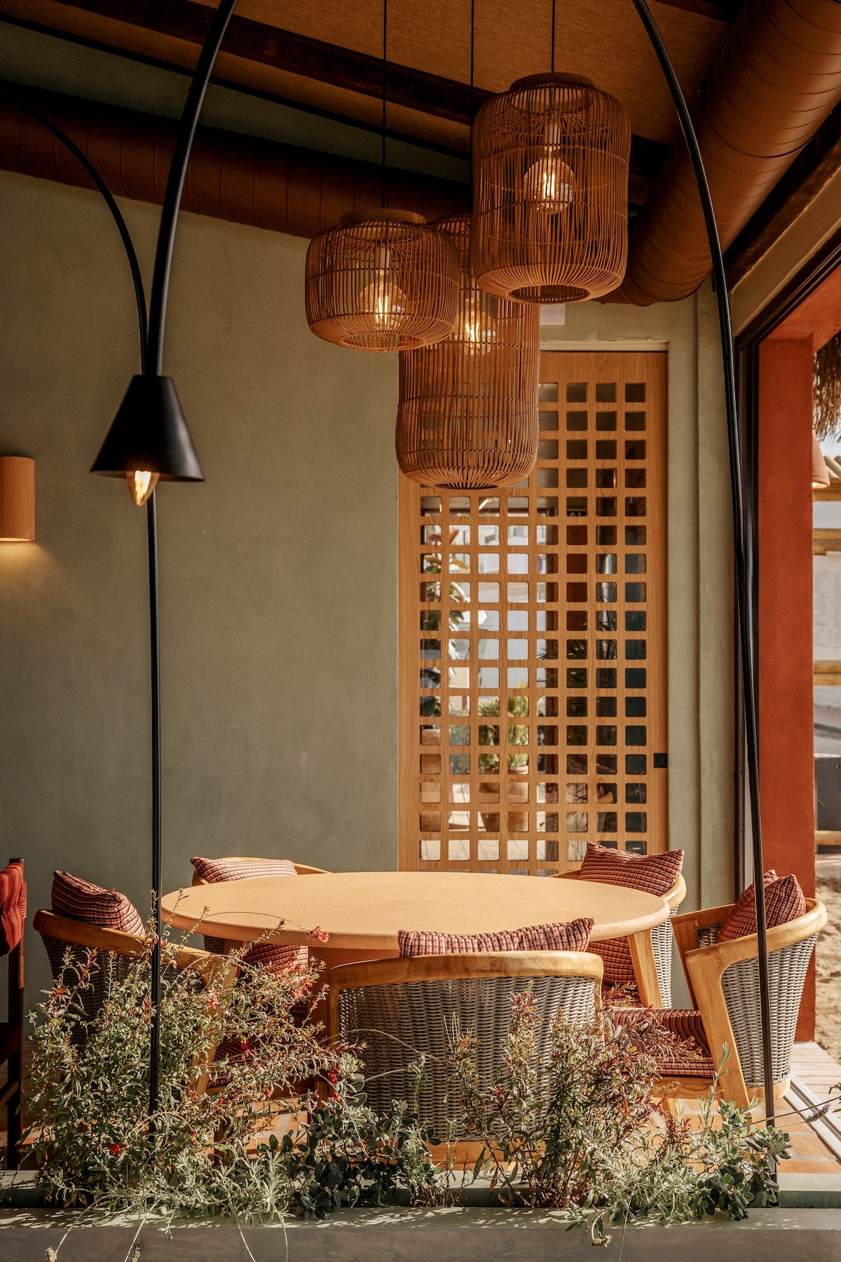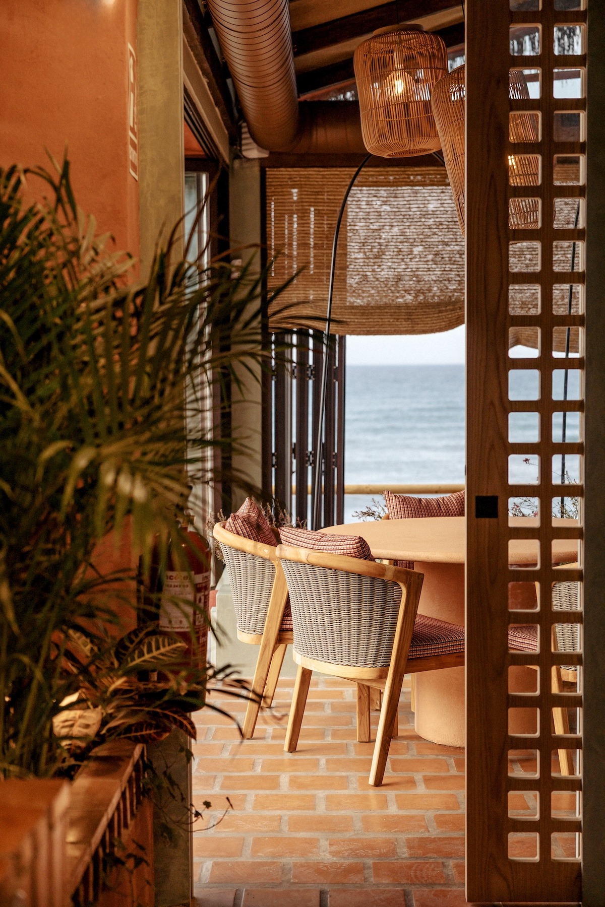 La distribución se desarrolla en zonas fluidas, diseñadas para disfrutar de la gastronomía y las vistas al mar sin barreras visuales, potenciadas por variaciones de altura y celosías que filtran la luz y generan intimidad. La paleta de colores adopta tonos cálidos—rojos, naranja mandarina y verde aqua—que destacan sobre superficies terrosas y resaltan la identidad del espacio. La experiencia se enriquece con interiores mediterráneos luminosos, acabados en cerámica de barro en los baños y un restaurante con cocina abierta que se conecta visualmente con el área de comedor.
