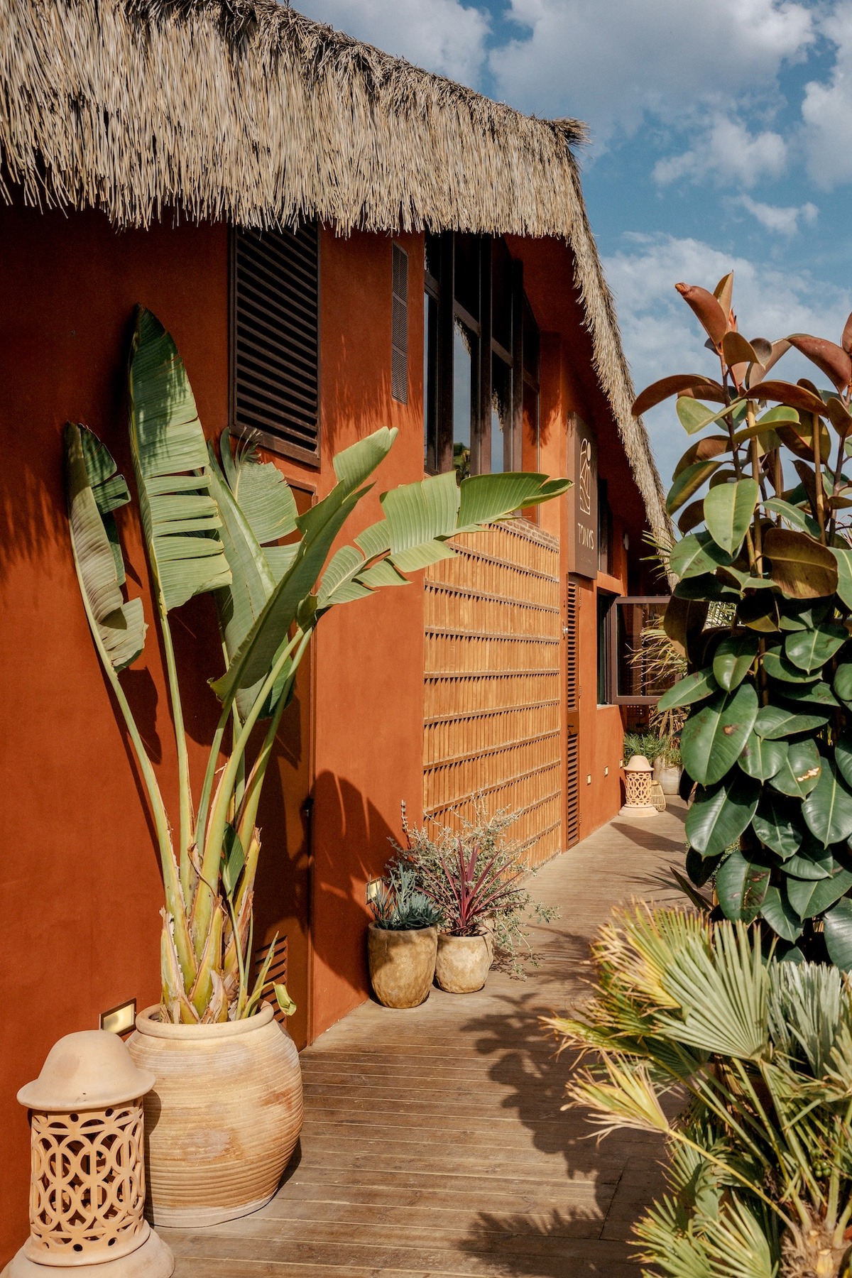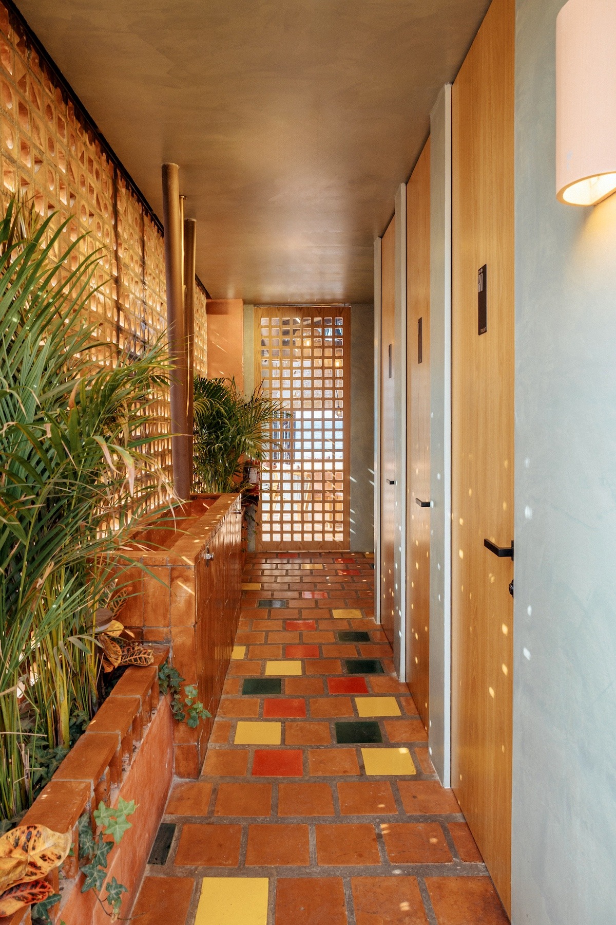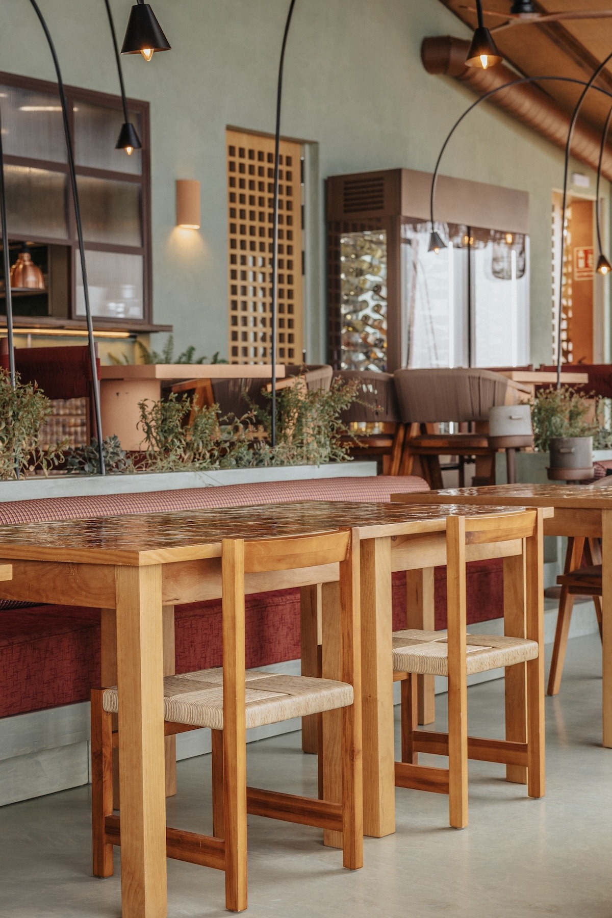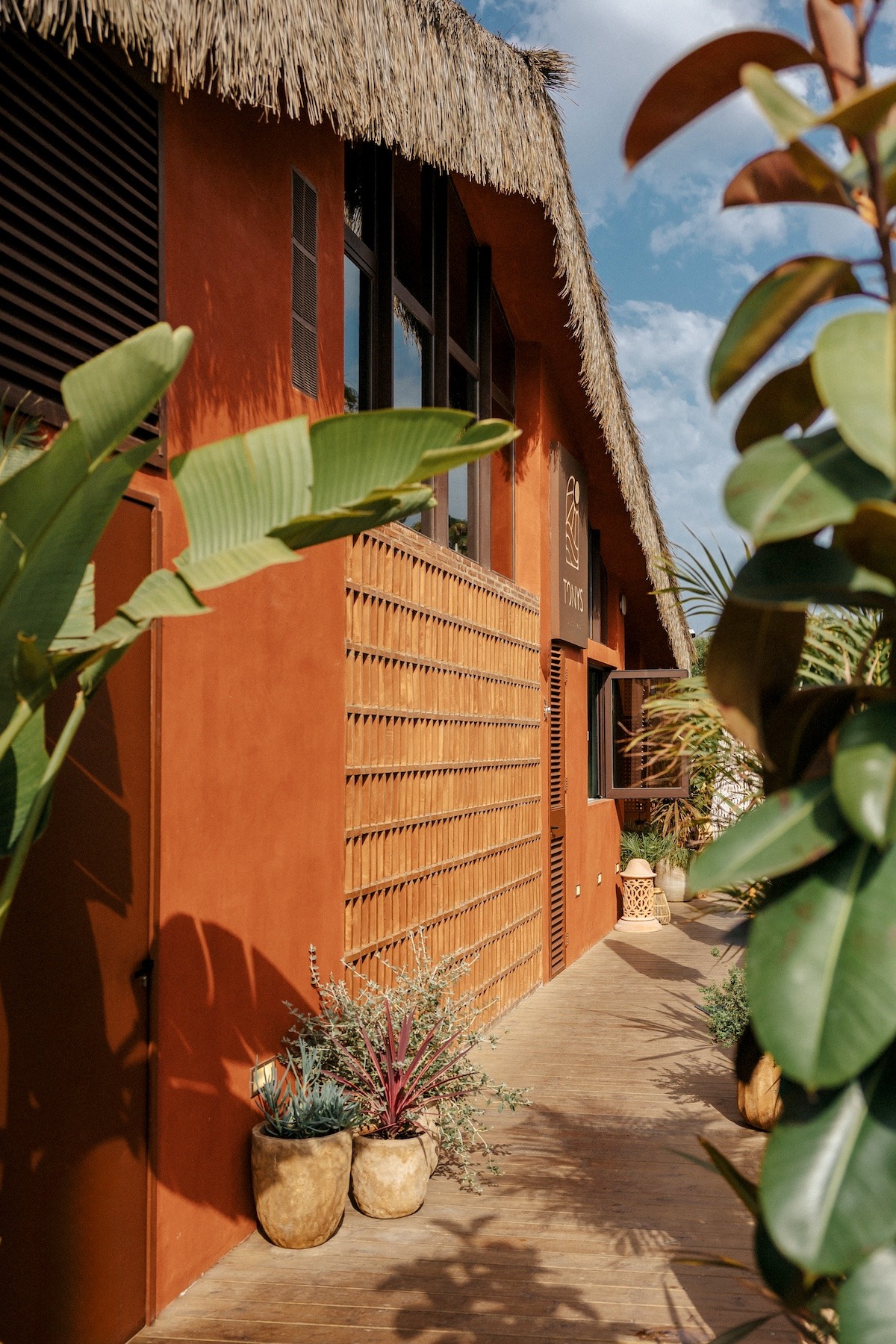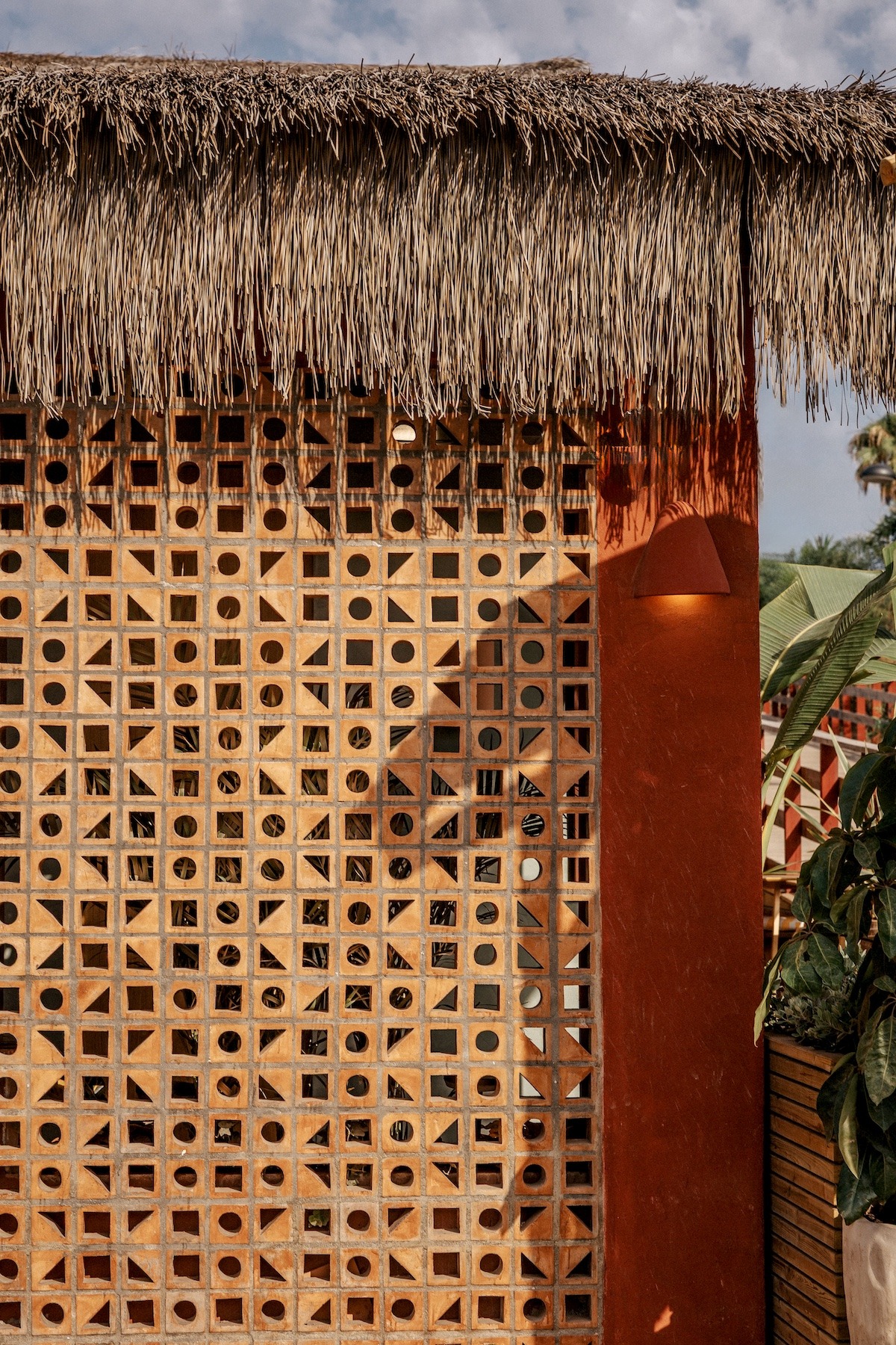 La distribución se desarrolla en zonas fluidas, diseñadas para disfrutar de la gastronomía y las vistas al mar sin barreras visuales, potenciadas por variaciones de altura y celosías que filtran la luz y generan intimidad. La paleta de colores adopta tonos cálidos—rojos, naranja mandarina y verde aqua—que destacan sobre superficies terrosas y resaltan la identidad del espacio. La experiencia se enriquece con interiores mediterráneos luminosos, acabados en cerámica de barro en los baños y un restaurante con cocina abierta que se conecta visualmente con el área de comedor.