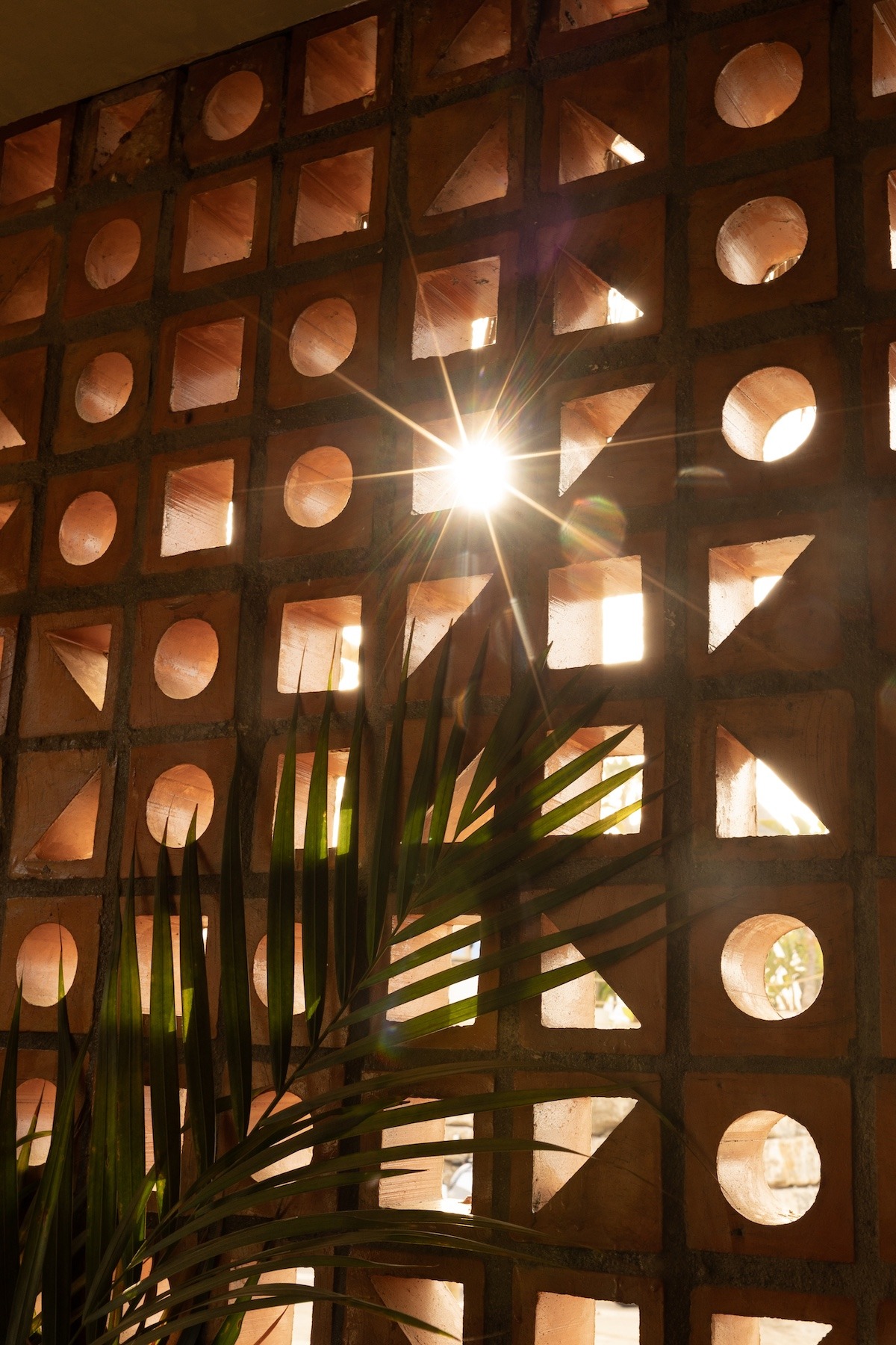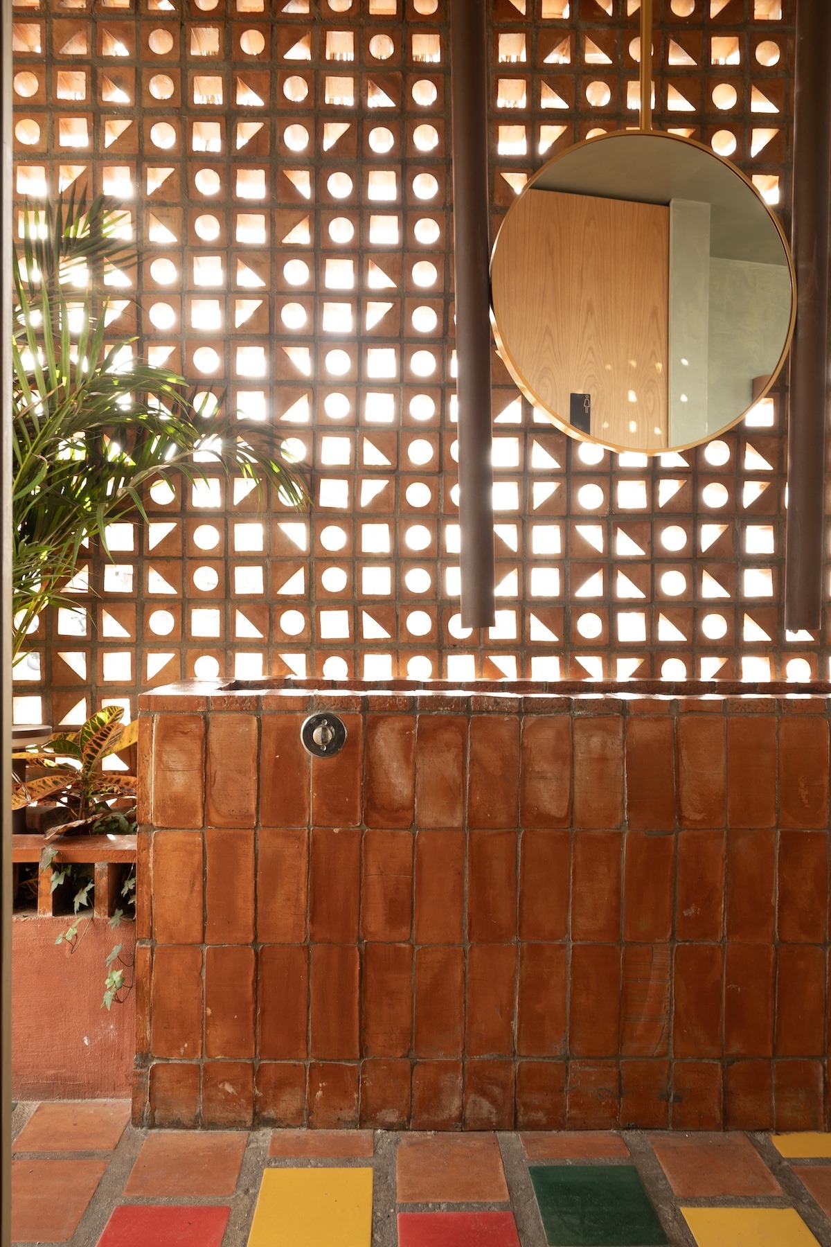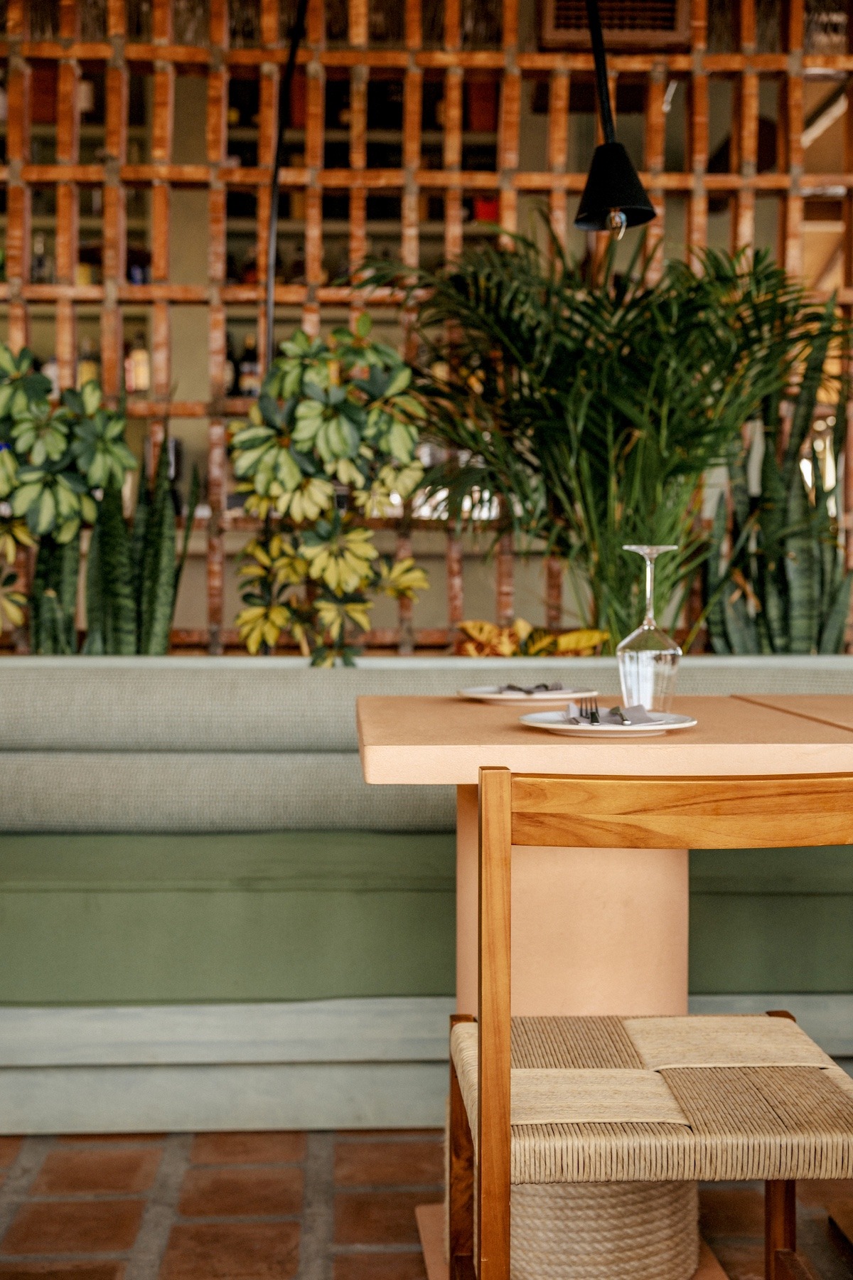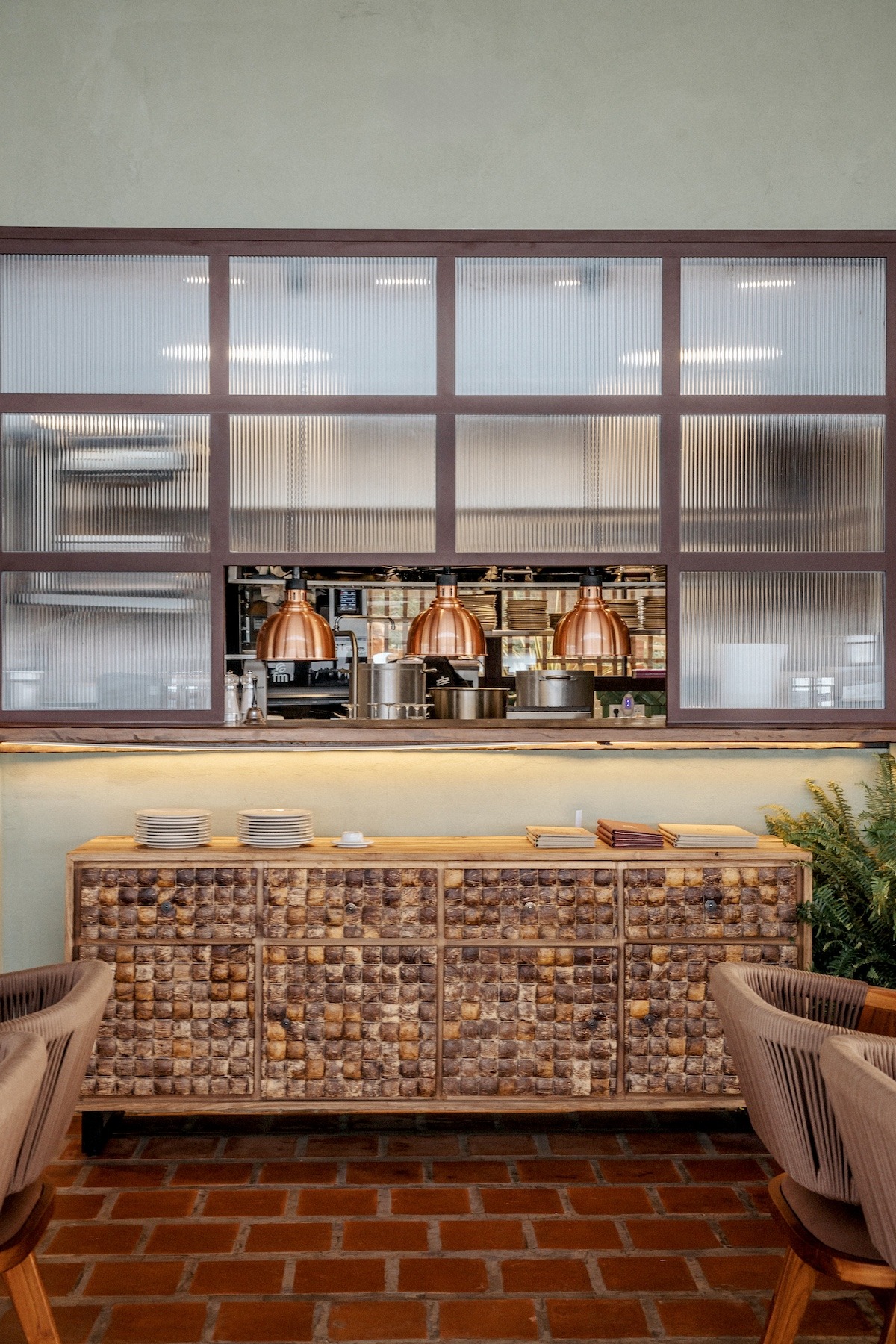 La distribución se desarrolla en zonas fluidas, diseñadas para disfrutar de la gastronomía y las vistas al mar sin barreras visuales, potenciadas por variaciones de altura y celosías que filtran la luz y generan intimidad. La paleta de colores adopta tonos cálidos—rojos, naranja mandarina y verde aqua—que destacan sobre superficies terrosas y resaltan la identidad del espacio. La experiencia se enriquece con interiores mediterráneos luminosos, acabados en cerámica de barro en los baños y un restaurante con cocina abierta que se conecta visualmente con el área de comedor.