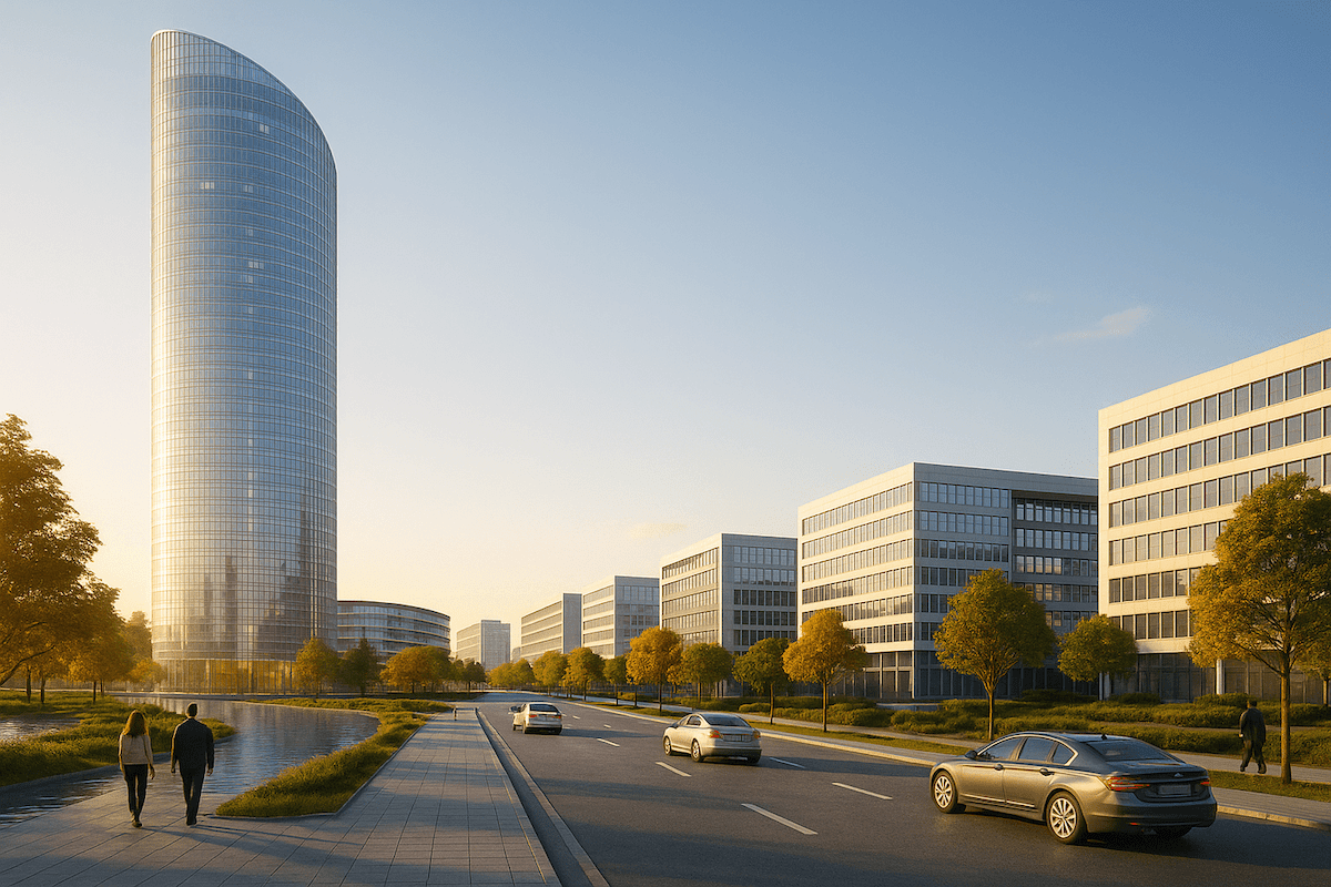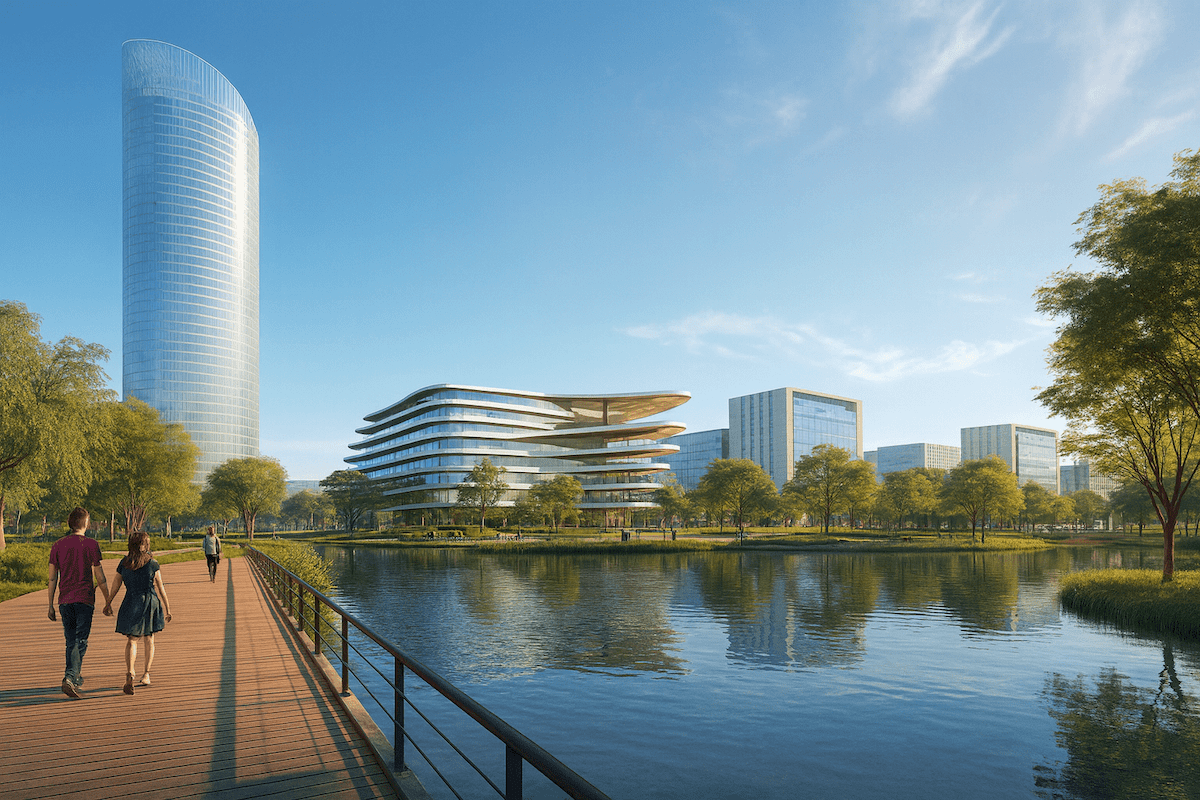 La torre icónica se erige como el símbolo del desarrollo: su esbelta y contemporánea silueta evoca una cascada, fuente del río que simboliza energía y conexión. A su alrededor, edificios de oficinas racionales ofrecen espacios de trabajo flexibles, luminosos y eficientes. Áreas verdes, paseos peatonales y plazas abiertas fomentan la colaboración y el intercambio. Más que un parque industrial, Eco Tech Industrial Park es un ecosistema creado para inspirar talento, impulsar la innovación y mejorar el bienestar en un entorno emblemático.