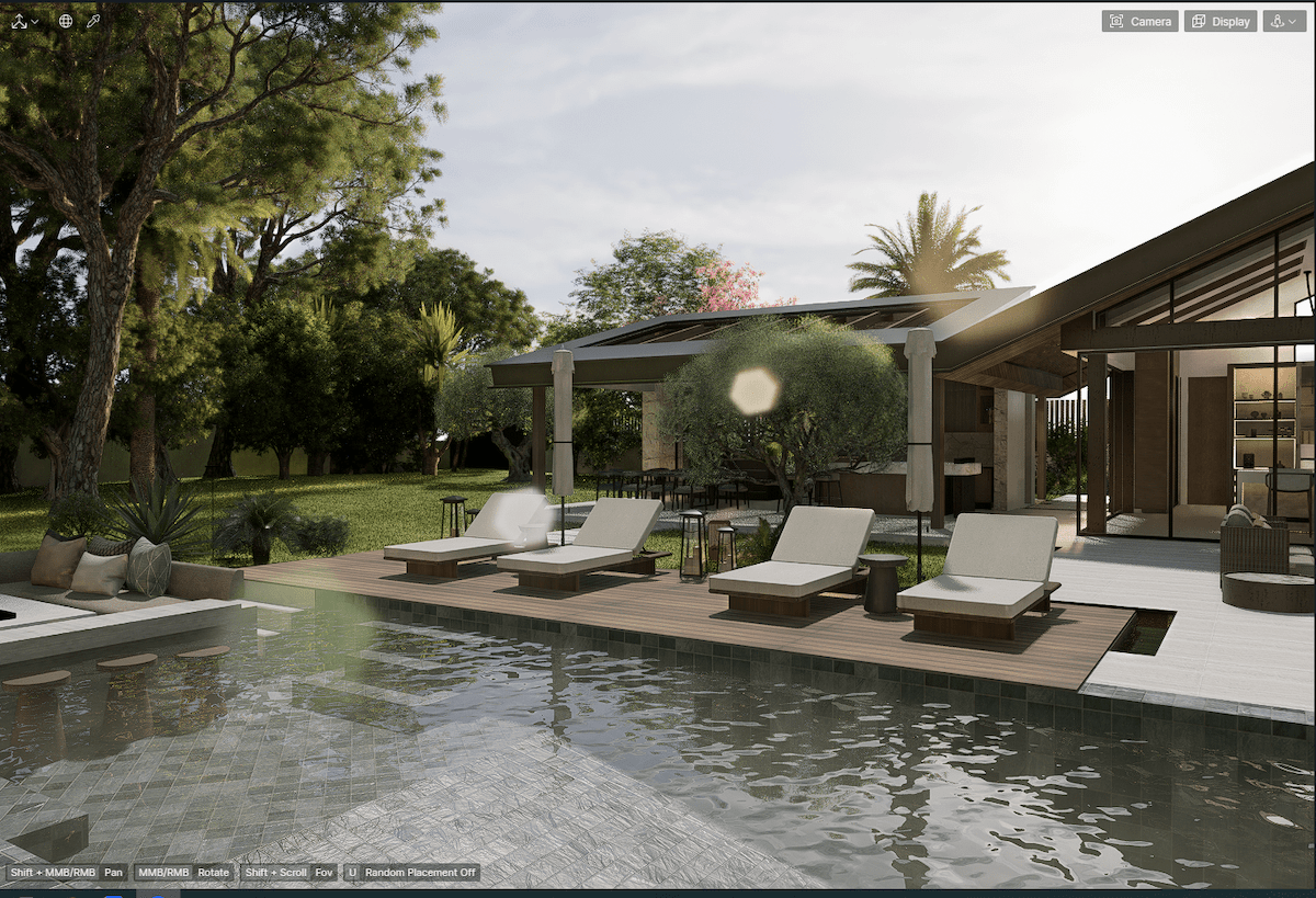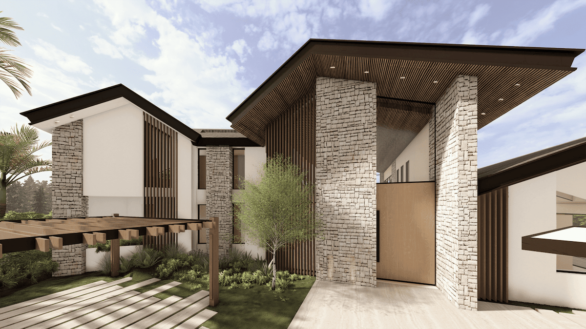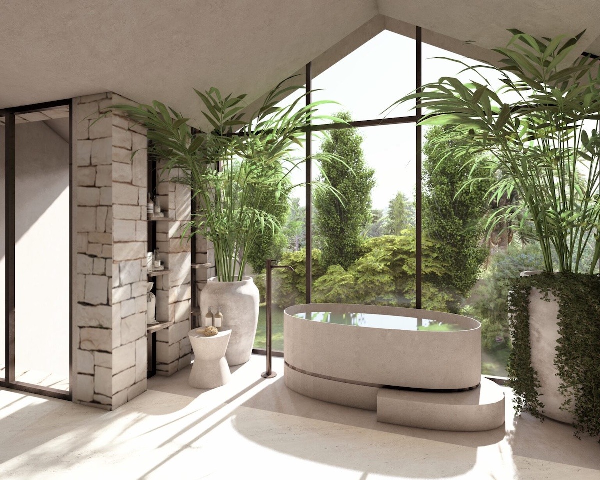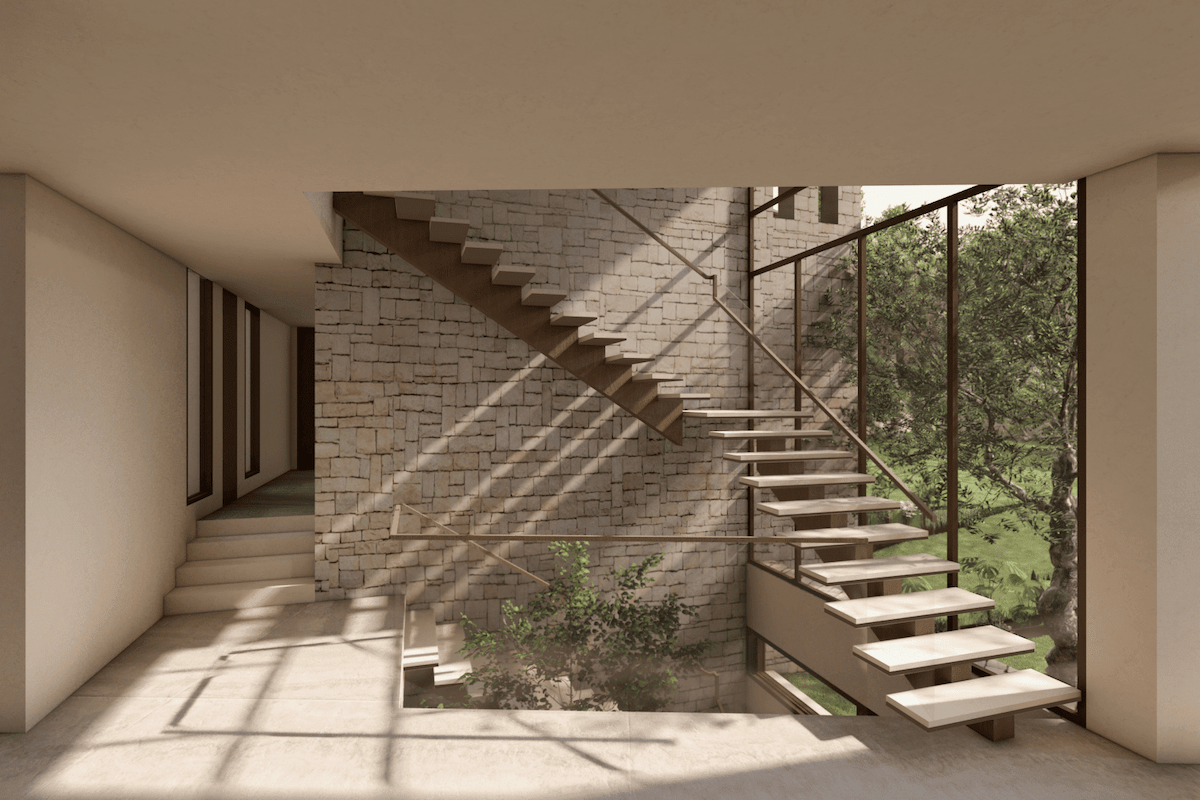 La paleta de colores se inspira en tonos naturales, terrosos y verdes, destacando la piedra y la madera en su estado más puro, contrastadas con el hormigón visto para un toque contemporáneo. El agua es protagonista, fluyendo dentro y fuera de la vivienda como un elemento vital y purificador que crea un vínculo sensorial con el entorno. Los espacios fluidos, las terrazas extendidas y las pérgolas conforman áreas exteriores que potencian el confort, la eficiencia energética y una conexión natural con el jardín.