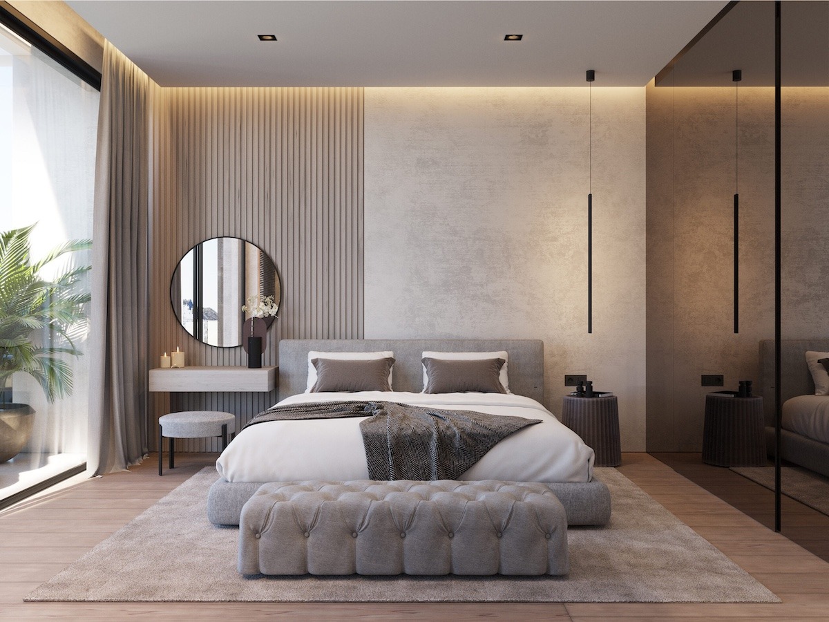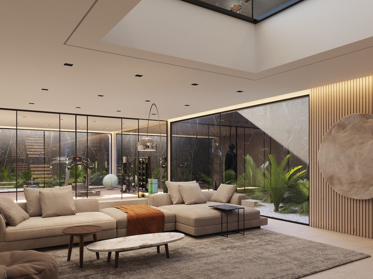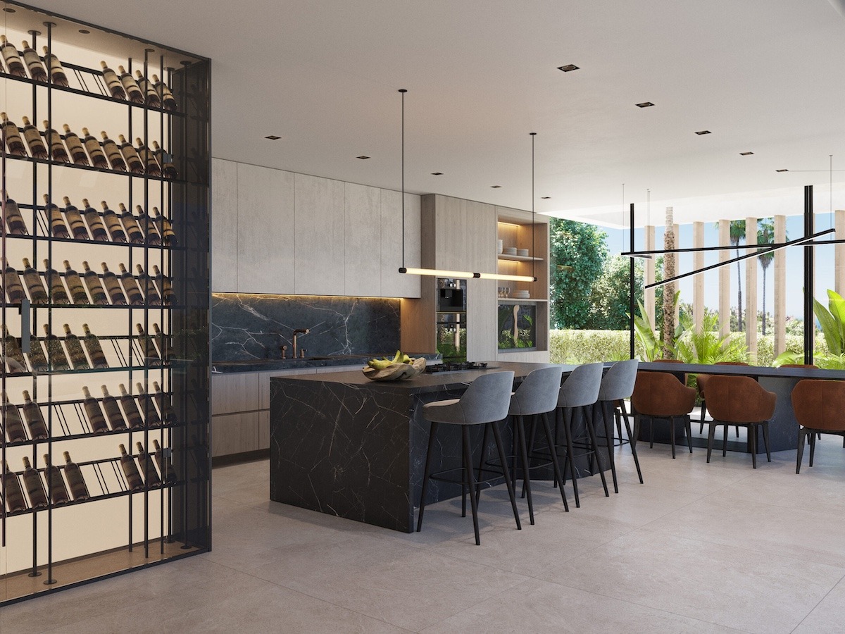 Compuesta por 5 dormitorios en suite y un total de 8 baños, se distribuye en 3 niveles. La distribución genera una experiencia fascinante y el efecto arquitectónico “wow” se hace evidente al entrar en la villa.