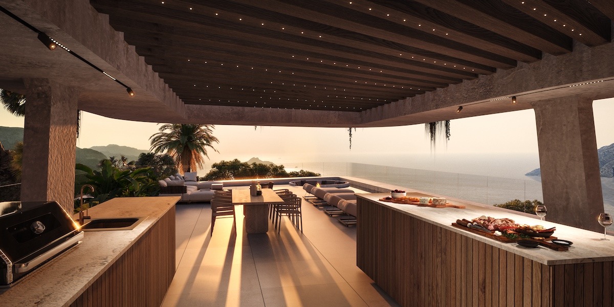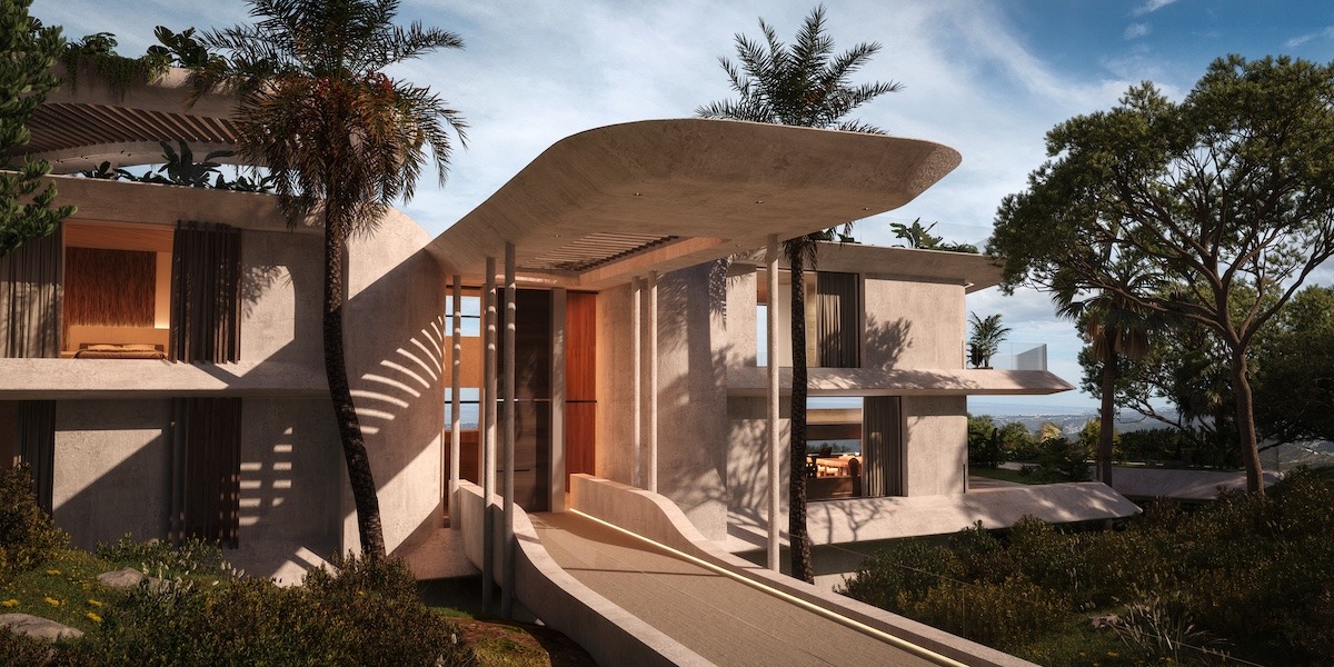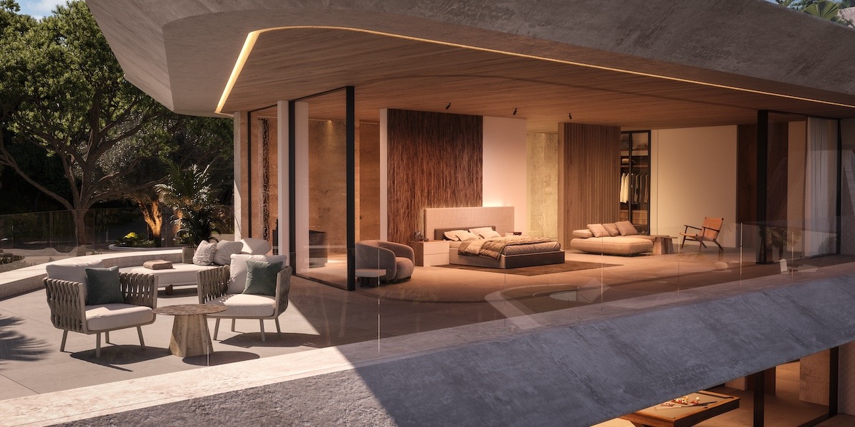 Los materiales naturales —piedra, madera y acabados refinados— se combinan con elementos sostenibles como cubiertas verdes y jardines integrados, reforzando el diálogo entre el lujo contemporáneo y el respeto al medio ambiente. Los interiores se definen por su fluidez: áreas sociales de planta abierta con vistas al mar, suites privadas con panorámicas y patios que disuelven los límites entre la naturaleza y la arquitectura.
