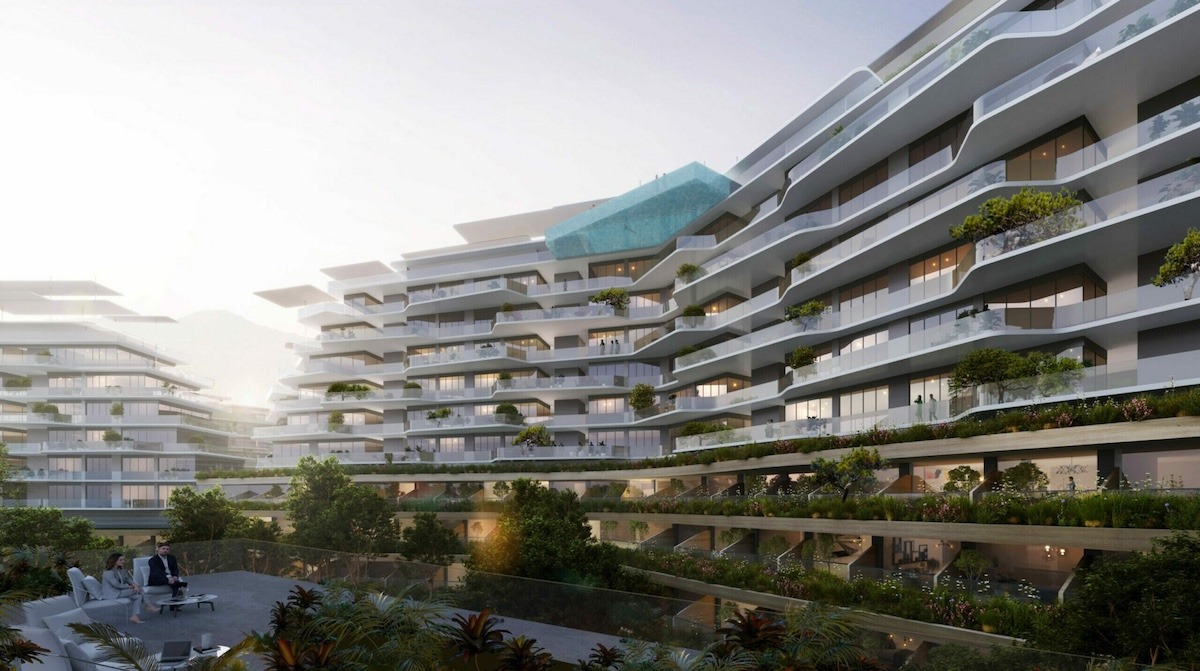建筑物沿河岸分布,由于其位置优越,可以欣赏到环绕这一现代化项目的自然景观。